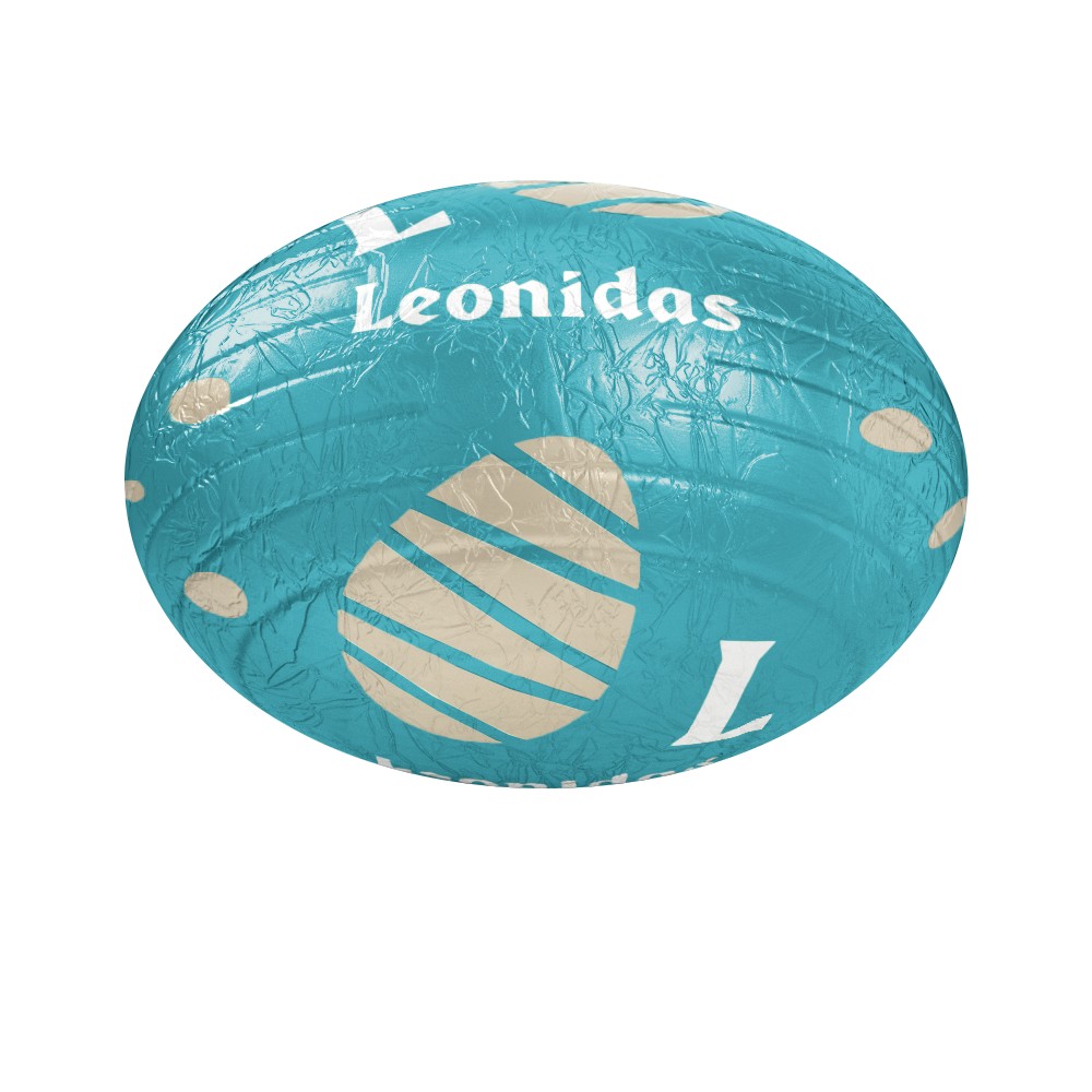 - Blue wrap with a zig zag egg: Milk chocolate with praliné and biscuit