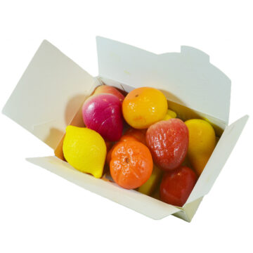Pure marzipan topped with a whole almond – Almonds, Sugar, Glucose syrup, Dextrose, Bitter almonds, Humectant (sorbitol), Water, Preservative (potassium sorbate), Acidifier (citric acid), Invertase. Strawberry Marzipan – Almonds, Sugar, Glucose syrup, Bitter almonds, Humectant (sorbitol), Flavouring (natural flavouring), Preservative (potassium sorbate), Acidifier (citric acid), Invertase, Colourings: carmine, curcumin. Tutti Fruiti Marzipan filling with pieces of candied fruit: melon, orange and passion fruit – Almonds, Sugar, Candied fruit (orange, melon), Cocoa butter, Whole milk powder, Humectant (sorbitol syrup), Inverted sugar, Glucose syrup, Flavourings (natural flavouring, natural vanilla flavouring), Emulsifiers: (soya lecithin), Preservative (potassium sorbate), Invertase. Pistachio flavoured marzipan– Almonds, Sugar, Cocoa mass, Glucose syrup, Pistachios, Cocoa butter, Bitter almonds, Water, Humectant (sorbitol), Emulsifiers: (soya lecithin), Acidifier (citric acid), Preservative (potassium sorbate), Invertase. Marzipan fruits – Marzipan (sugar, almonds (40%), Stabilizer: sorbitol, Inverted sugar syrup, Glucose syrup, Preservative: potassium sorbate, Flavouring, Glazing agent, Colourings: curcumin, beetroot red, E160a, E150c.
