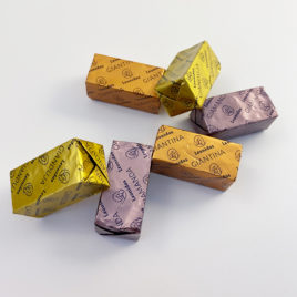 Pure marzipan topped with a whole almond – Almonds, Sugar, Glucose syrup, Dextrose, Bitter almonds, Humectant (sorbitol), Water, Preservative (potassium sorbate), Acidifier (citric acid), Invertase. Strawberry Marzipan – Almonds, Sugar, Glucose syrup, Bitter almonds, Humectant (sorbitol), Flavouring (natural flavouring), Preservative (potassium sorbate), Acidifier (citric acid), Invertase, Colourings: carmine, curcumin. Tutti Fruiti Marzipan filling with pieces of candied fruit: melon, orange and passion fruit – Almonds, Sugar, Candied fruit (orange, melon), Cocoa butter, Whole milk powder, Humectant (sorbitol syrup), Inverted sugar, Glucose syrup, Flavourings (natural flavouring, natural vanilla flavouring), Emulsifiers: (soya lecithin), Preservative (potassium sorbate), Invertase. Pistachio flavoured marzipan– Almonds, Sugar, Cocoa mass, Glucose syrup, Pistachios, Cocoa butter, Bitter almonds, Water, Humectant (sorbitol), Emulsifiers: (soya lecithin), Acidifier (citric acid), Preservative (potassium sorbate), Invertase. Marzipan fruits – Marzipan (sugar, almonds (40%), Stabilizer: sorbitol, Inverted sugar syrup, Glucose syrup, Preservative: potassium sorbate, Flavouring, Glazing agent, Colourings: curcumin, beetroot red, E160a, E150c.