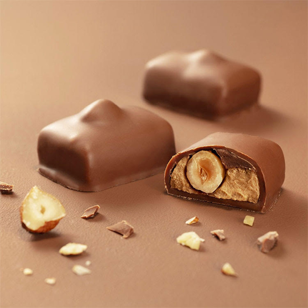 Manon Nougatina: Creamy milk chocolate filled with smooth hazelnut praline and delicately crunchy nougatine pearls — the perfect balance of nutty richness and sweet crunch.