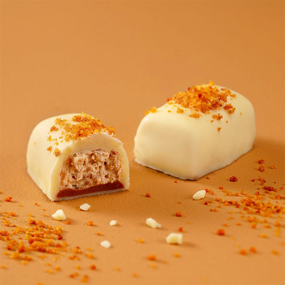 Manon Speculoos: White chocolate shell dusted with powdered speculoos, filled with creamy speculoos buttercream and a thin layer of praliné.