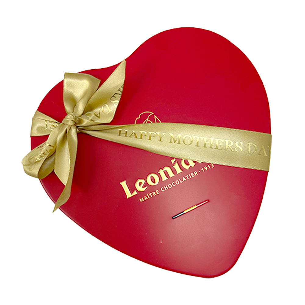 Choose your own assortment of 9 exquisite Leonidas Belgian chocolates, elegantly encased in a luxurious red tin heart gift box with bespoke ribbon.