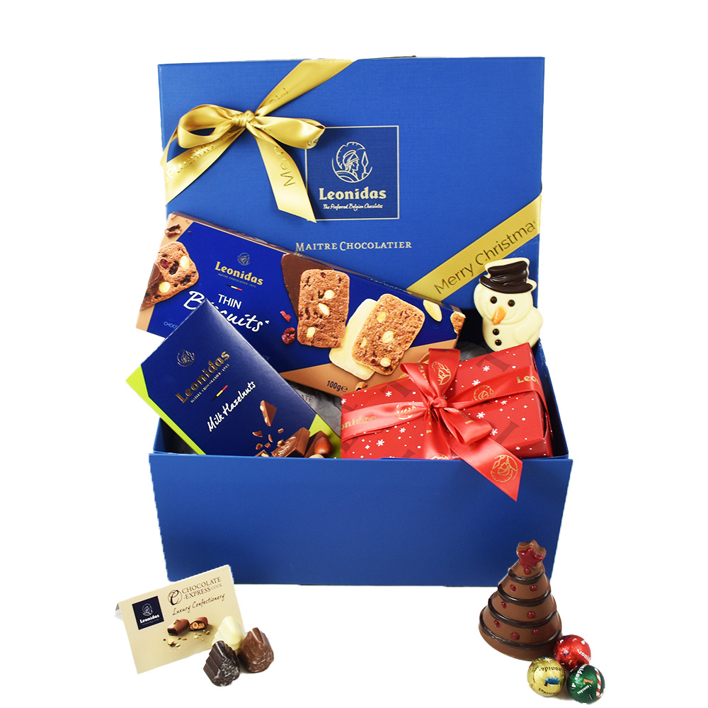 In addition to your chosen chocolates, our hamper also features a box of luxury leonidas biscuits, a large 100g Chocolate bars as well as an adorable milk or white chocolate molded snowman and Santa lollies.
