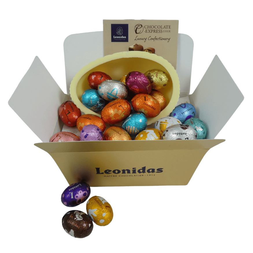 This beautiful creation features a half Easter egg shell crafted from rich, creamy Leonidas white chocolate, offering a luscious and smooth chocolate experience. Inside, discover a delightful assortment of 10 premium-flavored mini eggs, each carefully selected to bring a variety of decadent tastes and textures.